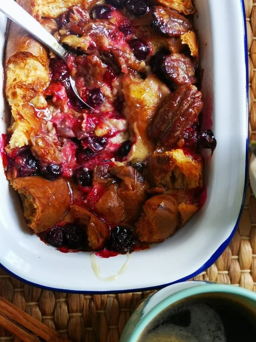 Versez le mélange d'œuf sur les morceaux de croissant et rajoutez les noix de pecans et les cassis, mélangez.