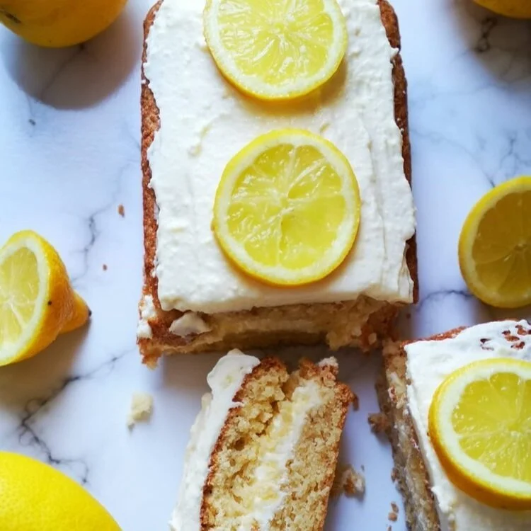 Tartinez l’intérieur du cake avec le glaçage et refermez le cake. Étalez un peu de glaçage sur le dessus du cake et décorez avec des tranches de citrons 🍋🍋